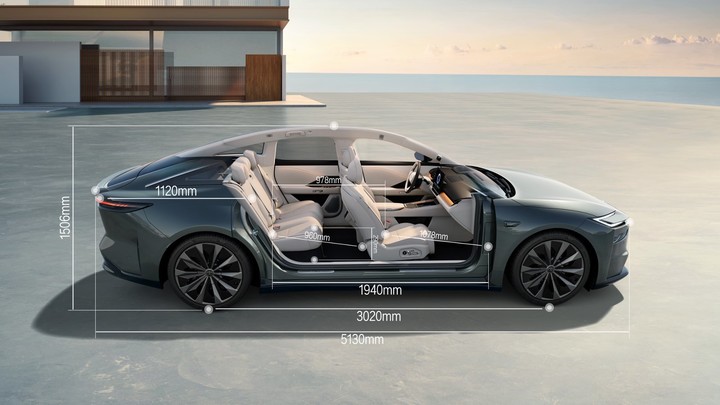 车身侧面则显得更有张力,车辆长宽高分别为车身尺寸 5130/1965/1500mm,轴距 3020mm,体量接近行政级轿车标准。
