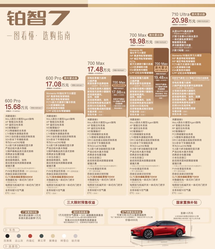 最让人惊喜的当然是价格,广丰铂智 7 叠加权益后的预售价为 15.68 万元,而配齐了鸿蒙座舱、激光雷达以及双腔空悬的版本为 19.48 万元。